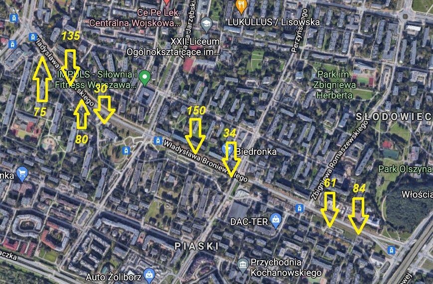 Co nam proponuje ZDM? Długość ul. Broniewskiego na wspomnianym wcześniej odcinku wynosi 1521m. Od tej wielkości należy odjąć 3 skrzyżowania po 50 metrów, oraz skrzyżowanie z Reymonta gdzie jest pas włączenia o długości 180m. Po odjęciu miejsc gdzie parkingów nie można ulokować, wychodzi nam 1521- 3×50-200 = 1171m. Zgodnie z rozporządzeniem Ministra Infrastruktury, długość miejsca parkingowego usytuowanego równolegle do jezdni, wynosi 6m. Jeśli podzielimy 1171/6 = 195. Z prostego wyliczenia wynika, że Zarząd Dróg Miejskich nie chce wybudować dodatkowych parkingów, a chce pozbawić mieszkańców 455 miejsc parkingowych w tej okolicy.