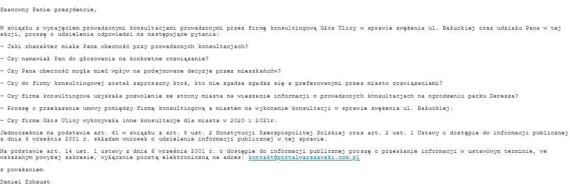 – Proszę o przekazanie umowy pomiędzy firmą konsultingową a miastem na wykonanie konsultacji w sprawie zwężenia ul. Bałuckiej.