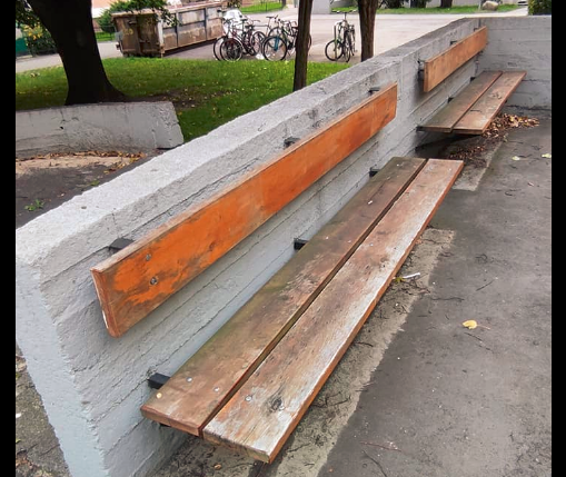 W pierwszej kolejności – w październiku 2019 – Administracja zleciła malowanie murków oporowych, z których to farba zaczyna już w wielu miejscach schodzić. Szczególnie na płaszczyznach poziomych. W drugiej kolejności – w listopadzie – Administracja zleciła montaż nowych desek na ławkach z oparciami. Potem na wiele miesięcy zostawiono piaskownicę, z której wystawały ostre płaskowniki okuć siedzeń po obu stronach. Przyszedł marzec, i kiedy zaczęliśmy się dopominać, że prac nie dokończono zlecono ostatecznie montaż nowych desek. Od tamtej pory minęło półtora roku, a deski już nadają się do wymiany!