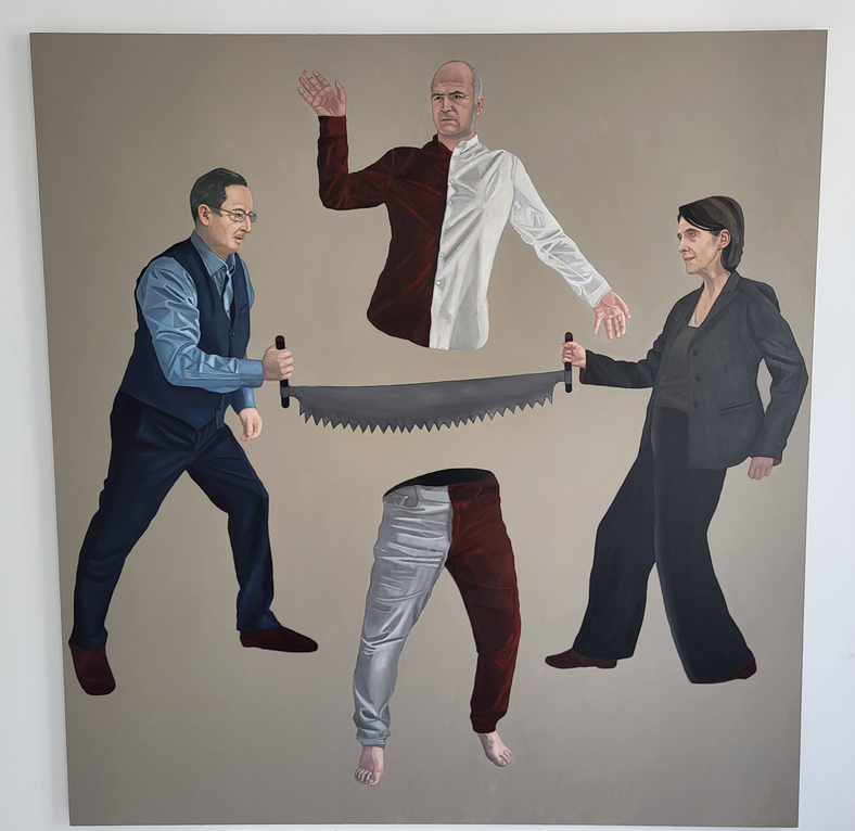 To co zostanie po tej smutnej pani to białe, brudne trampki które założyła na okoliczność pamiętnego hołdu berlińskiego przy kamieniu niemieckiej hańby oraz wizerunek upamiętniony w obrazie „Moja-Twoja” przez jej ofiarę – Ignacego Czwartosa, brutalnie ocenzurowanego i odartego z możliwości reprezentowania Polski na Biennale w Wenecji. Chciałoby się zatem rzec, że ciszej nad tą trumną, ale właściwie nie napiszemy tego – dlaczego, o tym za chwilę, ale z czystej ludzkiej przyzwoitości doradzimy, by Pani Hania już się zaczęła rozglądać za porządną kancelarią prawną, bo na schowanie się pod parasol doktryny Neumanna raczej chyba za późno. Tam zresztą za chwilę będzie bardzo ciasno, więc też nie rekomendujemy.