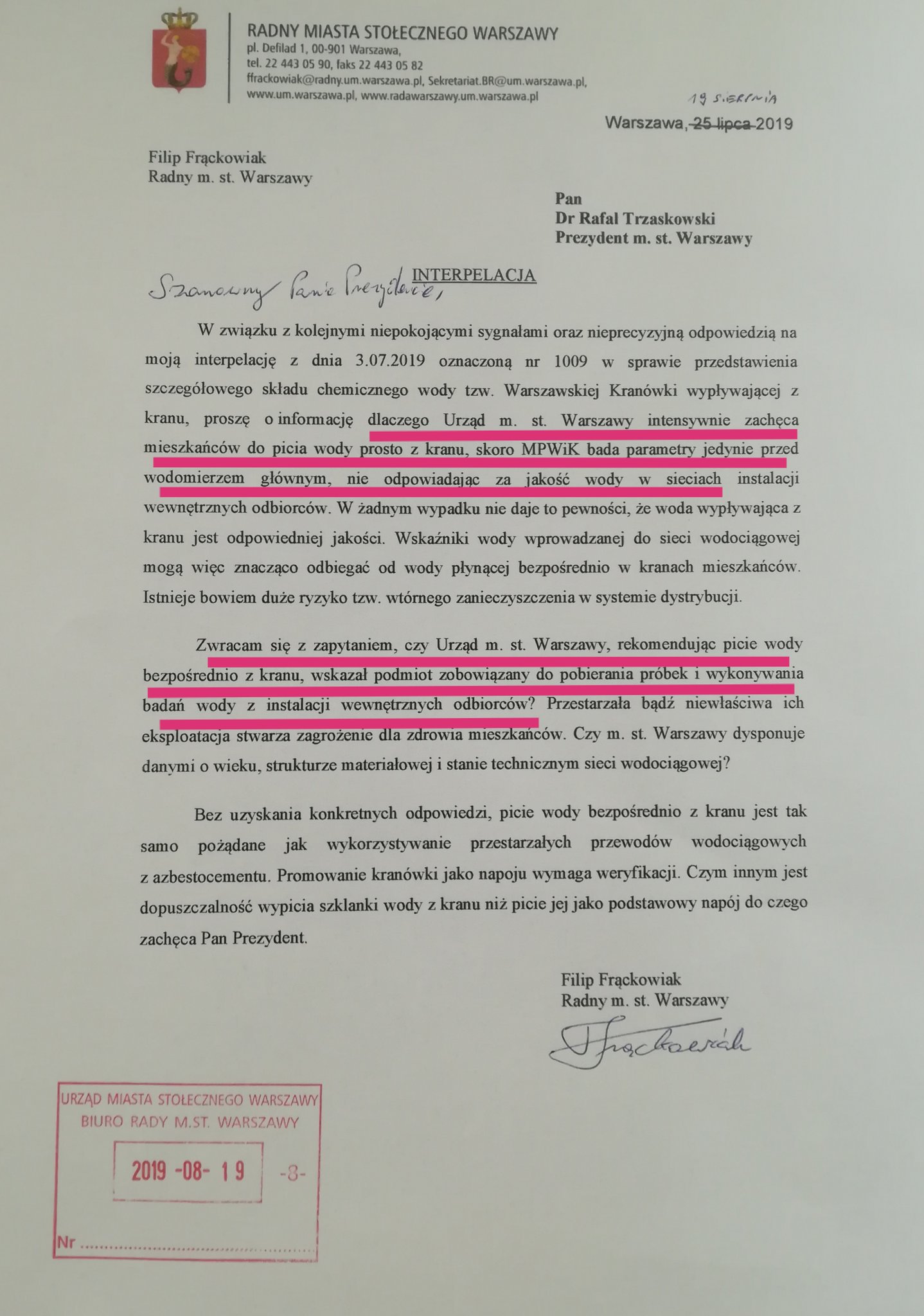 Radny Warszawy, Filip Frąckowiak, zamieścił na swoim profilu informację jakoby Rafał Trzaskowski kłamał w sprawie naszej warszawskiej kranówki i daje do zrozumienia, że woda, którą pobieramy z naszych kranów nie była badana.