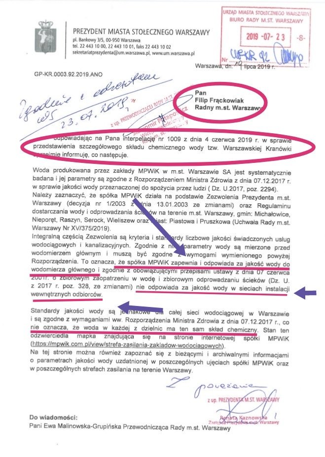 Co jakiś czas na różnych warszawskich profilach pojawiają się niepokojące informacje o fatalnym stanie warszawskiej kranówki, szczególnie po prawej stronie Wisły. Bo o dziwnym kolorze naszej kranówki i dziwnym zapachu informują , niestety dość regularnie, mieszkańcy prawobrzeżnej Pragi, Północ i Południe, ale i Woli. Jak wiemy za stan warszawskiej wody odpowiada Miejskie Przedsiębiorstwo Wodociągów i Kanalizacji. Dlatego też w maju tego roku skierowaliśmy do nich nasze pytania.