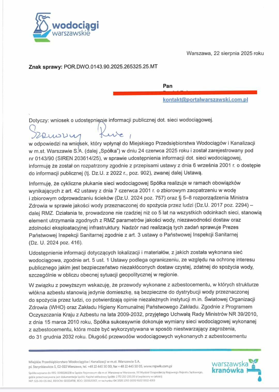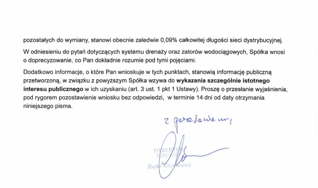 W dniu 8 lipca tego roku dostaliśmy odpowiedź od Dyrektora Pionu Wody Pana Rafała Chiniewicza.